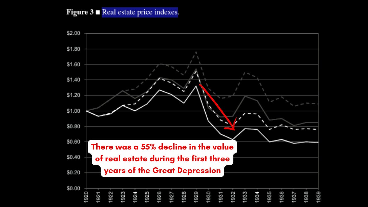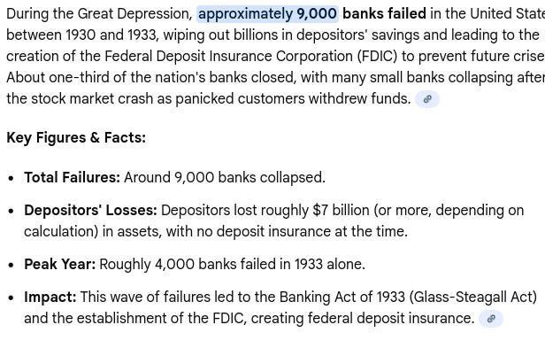 A similar pattern unfolded during the Great Depression. It began with the stock market collapse, which triggered a cascading credit contraction and the failure of banks across the country. Depositors saw their savings wiped out as institutions closed their doors. With the banking system in chaos, credit froze, collateral values collapsed, and industrial activity ground to a halt. Millions were thrown out of work. Mortgages fell into delinquency en-masse and many citizens wound up losing their family farms to the big banks.