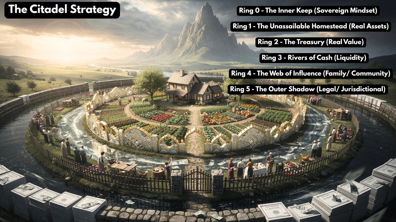 As we move into harder times, the goal is not to fight the system head-on—that is a battle you will almost certainly lose. The goal is to defend ourselves against it, by becoming sovereign and resilient. If the Great Taking ensues, the system is engineered to take what is easiest to seize: digital accounts, brokerage portfolios, domestic vaults, mortgaged property, and pension funds or 401(k)s—all of which are neatly catalogued and trapped within the system. At this stage, it’s unlikely we can stop them, but your Citadel, deliberately built across all five rings and standing in the shadows, remains far beyond their reach.