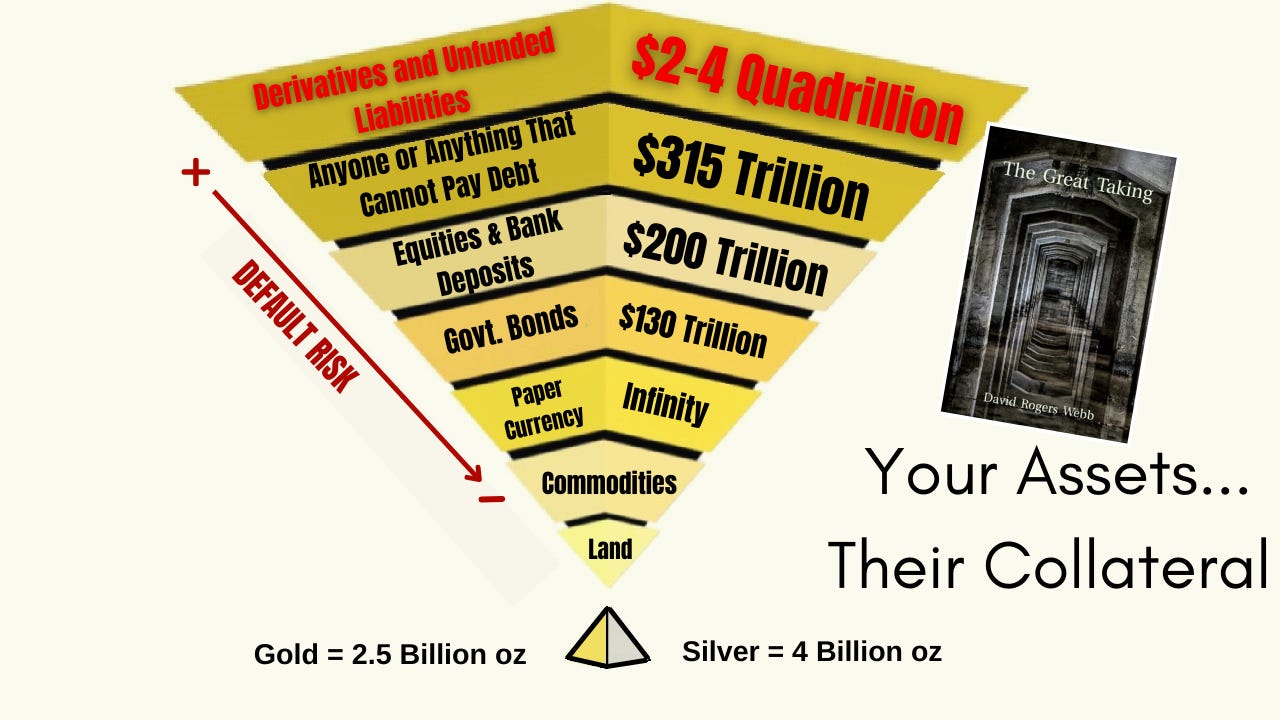 For all these reasons, any serious discussion about protection from something like the Great Taking is inherently complex. It must go far beyond simplistic advice such as “just buy gold.” The real threat is not isolated confiscation, but a full-spectrum breakdown: counterparty failures, collapsing collateral chains, evaporating liquidity, and the shutdown of the very channels through which assets are normally transferred or sold—followed by societal implosion and a rising tide of anger, fear, and despair.