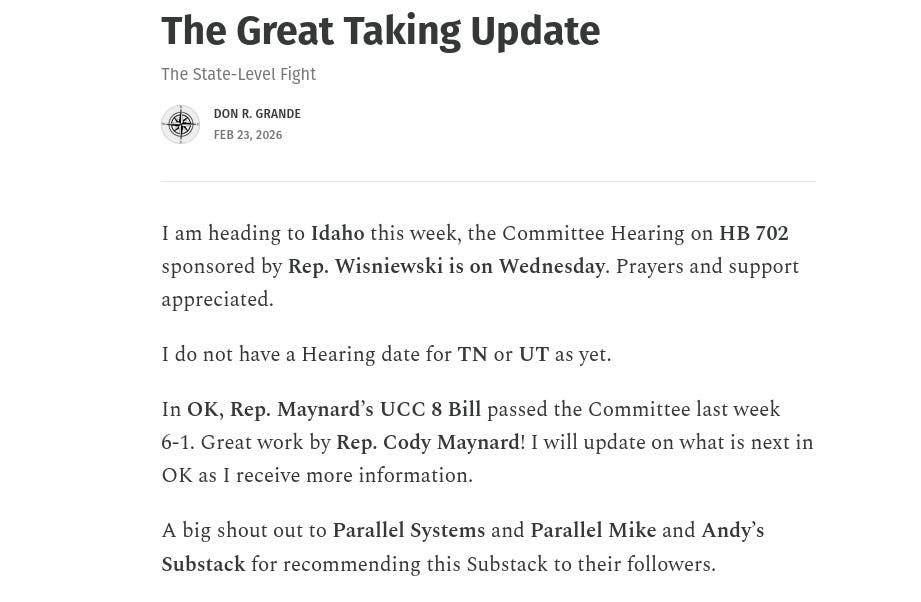 The second thing I wanted to alert you all to is the ongoing pushback against the Great Taking at the state level in the U.S. So far, a number of state legislators have sponsored and progressed bills seeking to reform the UCC, specifically Article 8. Don Grande is doing a great job heading the small legal team that is helping to drive forward these bills. On this front we have some good news: just last week, with the help of Representative Cody Maynard, Oklahoma passed a bill in committee by a 6-1 vote. Idaho is up later this week, followed by Tennessee and Utah, with those dates yet to be confirmed. All it takes is one single state to successfully enact reforms and a domino will be pushed that leads to a nationwide recognition of the subversion at play.