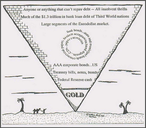At the very base of the pyramid, Exter placed gold—alone and physically separated from the rest of the structure. He believed that in a true financial meltdown, the most valuable asset would be one with no counterparty risk, no default risk, and no dependence on the solvency of any institution. Gold, in his view, was the only asset that met these criteria.